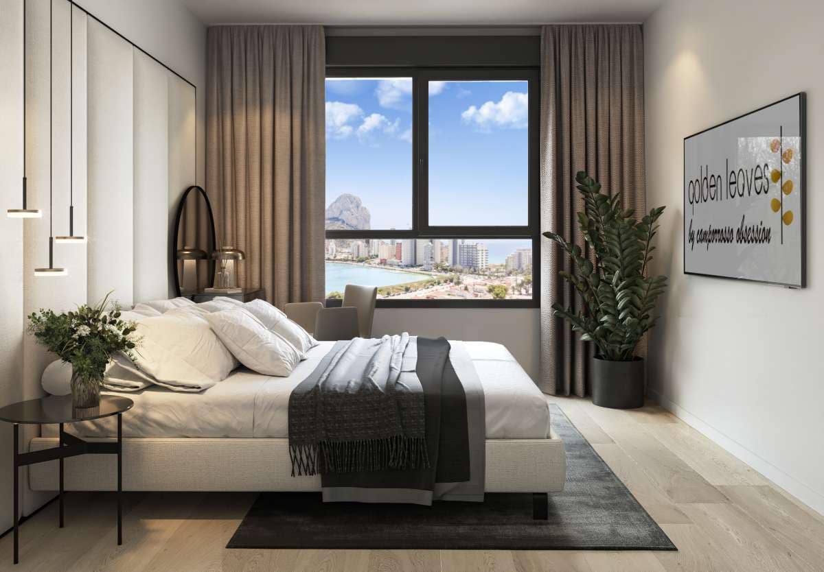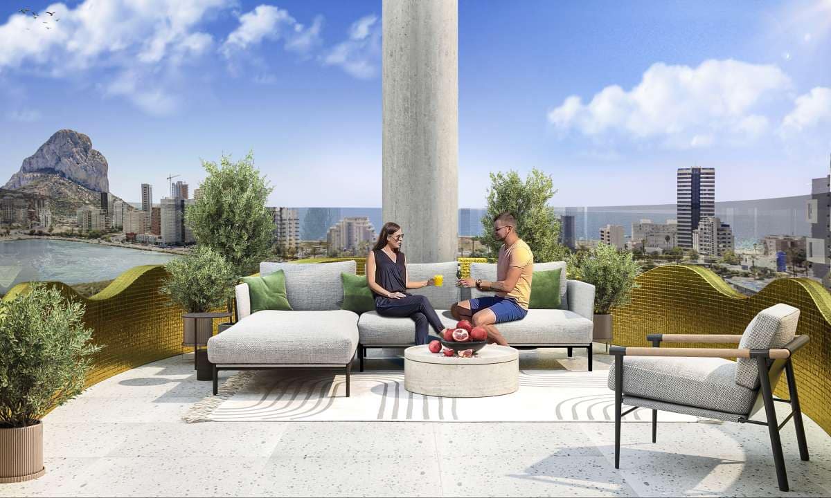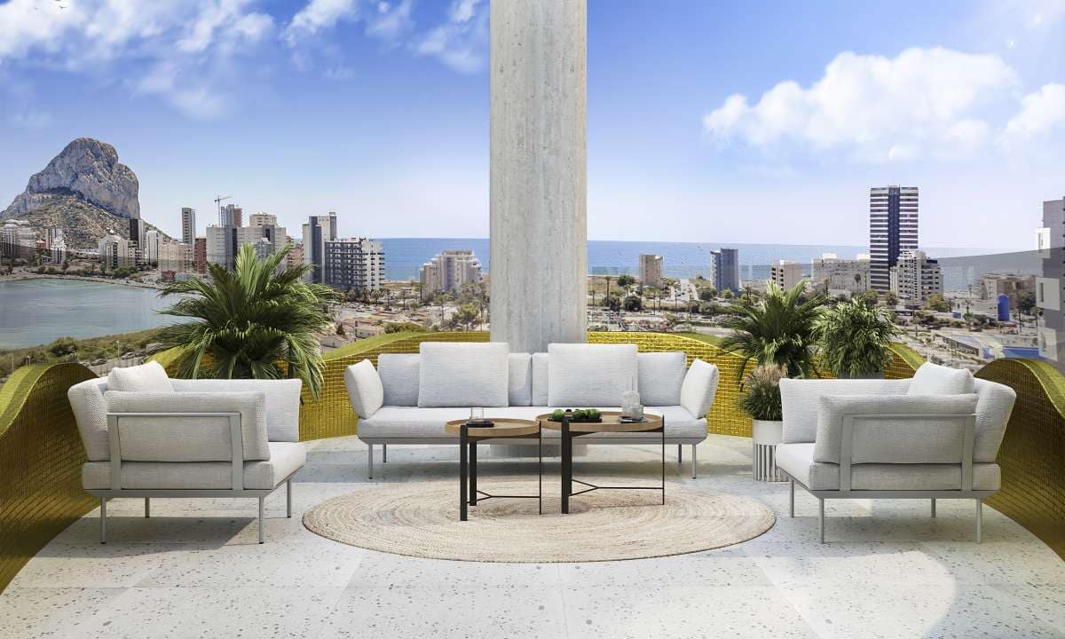 Each home has a large terrace, a circular view of all the best of Calpe: Arenal beach, Fossa beach, Las Salinas lagoon, and of course the Peñón de Ifach.br>br>Every morning, every afternoon, … living integrated into the sky of Calpe… Only a plot of land for school use separates you from Las Salinas.br>br>It has a swimming pool, paddle tennis, gym, calisthenics area and children’s games in spacious common areas. br>br>And its exceptional aesthetics shines from an axis, a trunk, with ceramic cladding in white and gold, marble textures. From which sprout, like leaves, terraces enamelled in a striking luminous and brave gold.br>br>