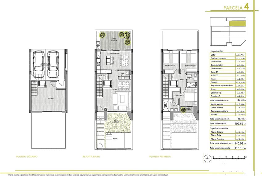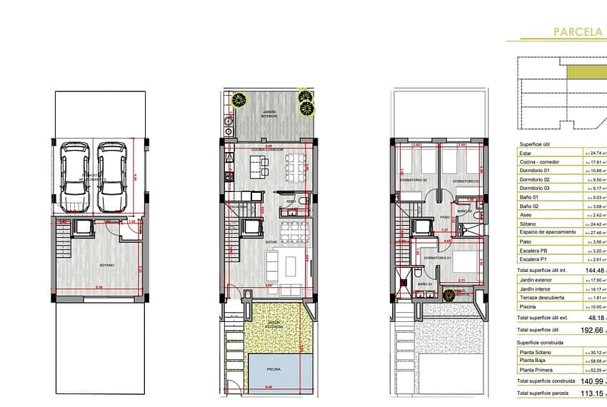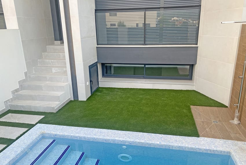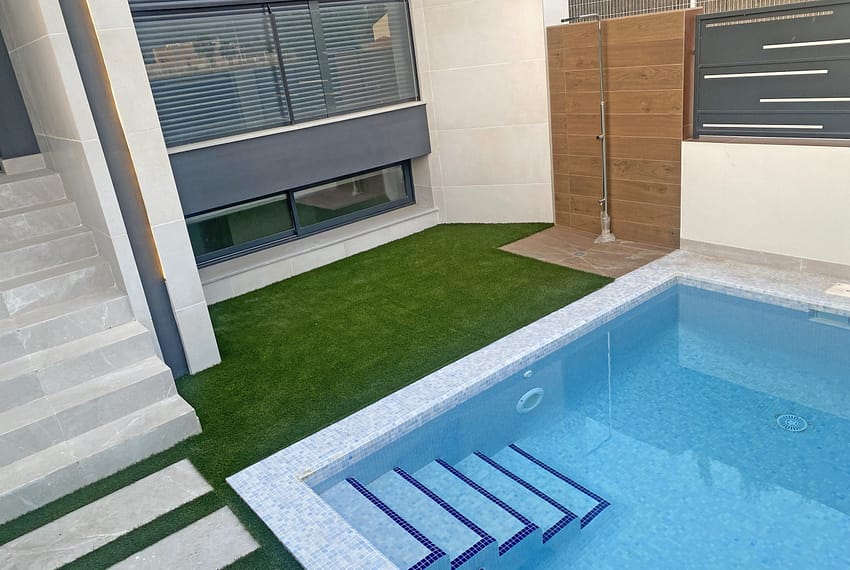 The built-up area of the property is 136 m² and the usable outdoor area is 48 m². A/C hot/cold with heat pump. Total superficie útil interior: 144.48 m2 + Total superficie útil exterior 48 m2 (interior courtyard, garden, pool aprox. 10m2 with a outdoor shower a balcony).
