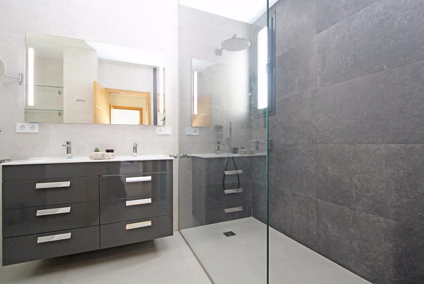 An elegant open staircase leads to the upper level, where you will find two additional bedrooms that share a modern bathroom, as well as a third bedroom with its own private ensuite bathroom. All the bedrooms have direct access to a large terrace, perfect for enjoying the panoramic views, and each bedroom is fitted with automatic shutters for convenience and privacy.