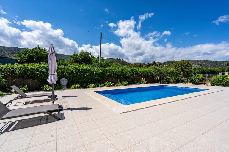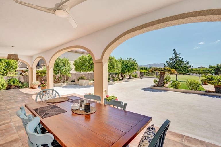 You arrive at the property which is fully fenced and has some beautifully engineered electric gates into a generous drive way which has lighting all the way along. The property offers more than ample parking and has a double bay carport for shade. The property is situated in a very well thought out garden it has a lovely fully irrigated grass lawn( 1000sqms)and has been thoughtfully planted to create an immaculate Mediterranean garden. We find a delightful 8×4 m pool which has a modern style of Roman steps running across the full width for ease. The pool terrace is generous with 170 sqms to be enjoyed. The whole plot is perfect for relaxing, outdoor dining and entertaining.