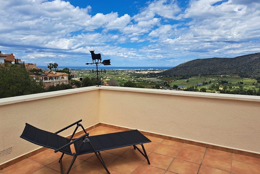 At the heart of the home is a magnificent living space, complete with double-height ceilings, a large wood-burning stove and sliding patio doors that open onto an expansive terrace and pool area with breathtaking views over the 27 hole golf course across the valley to the blue of the Mediterranean and the many colours of Montgó mountain and natural park —perfect for relaxing, outdoor dining and entertaining.